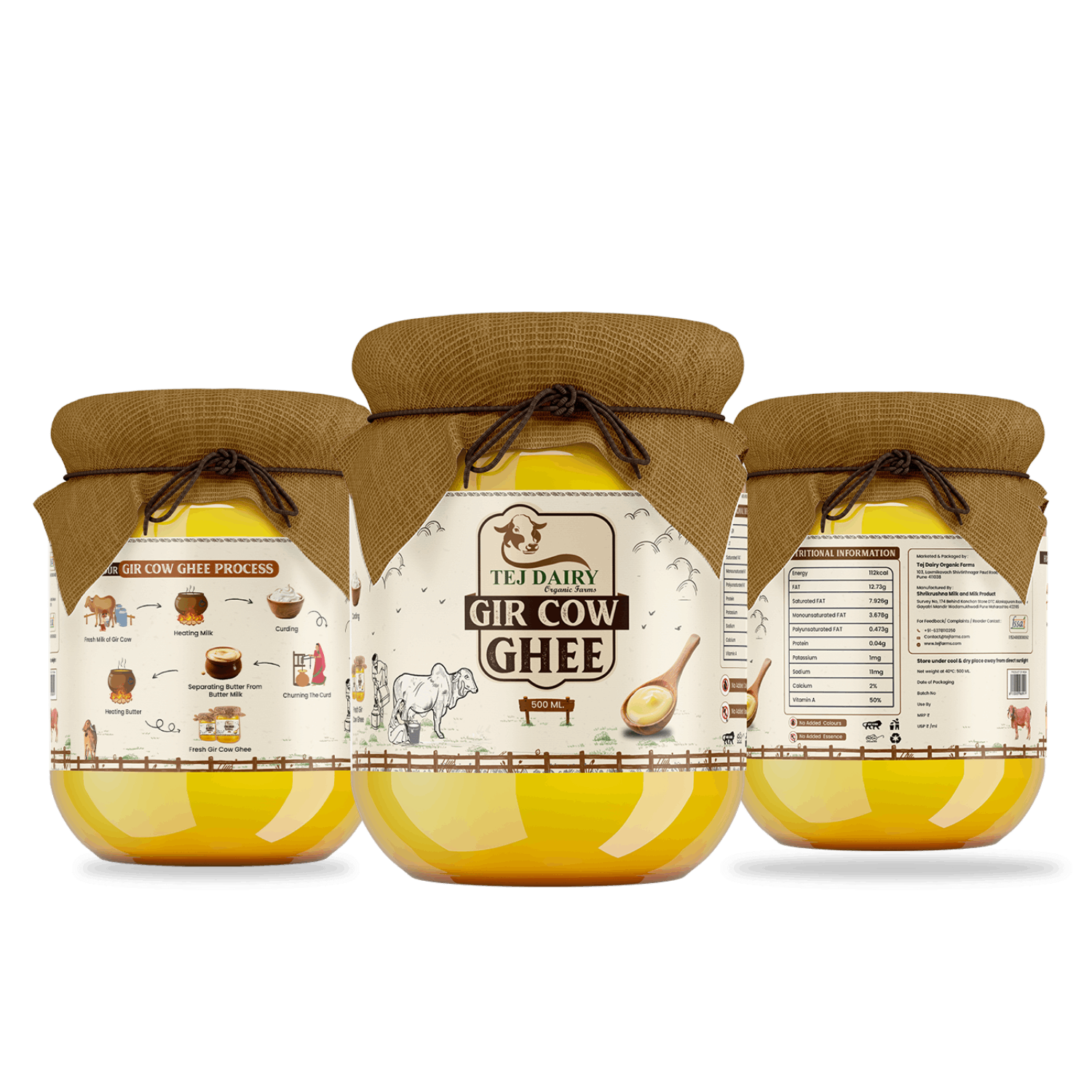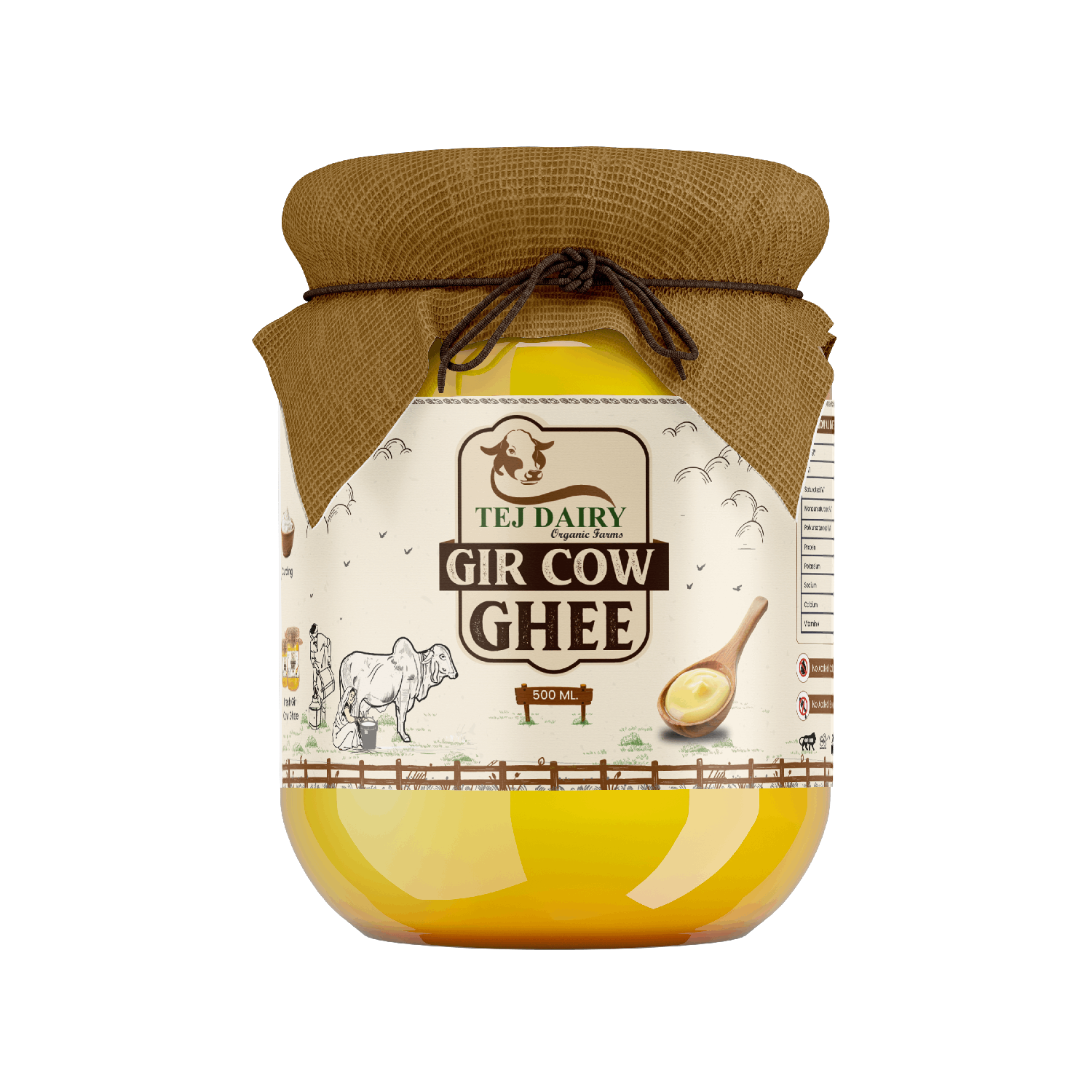 Gir Cow Cultured Ghee is made using fresh Gir cow milk. The milk is brought to a boil and naturally cooled down to room temperature and inoculated with a natural starter culture and left overnight to make yoghurt. The yoghurt is churned during pre-dawn hours (4 am - 6 am) to separate raw white butter using the ancient process of 'Bilona' - clockwise-anticlockwise slow churning.
